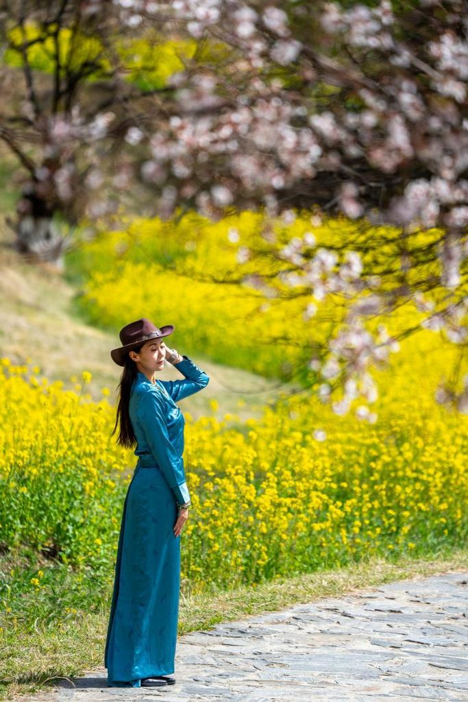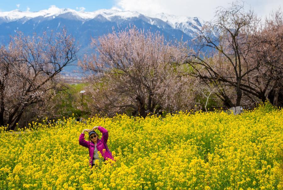2日、ニンティ市巴宜区嘎拉村でポーズを取る観光客。(ニンティ=新華社記者/丁増尼達)