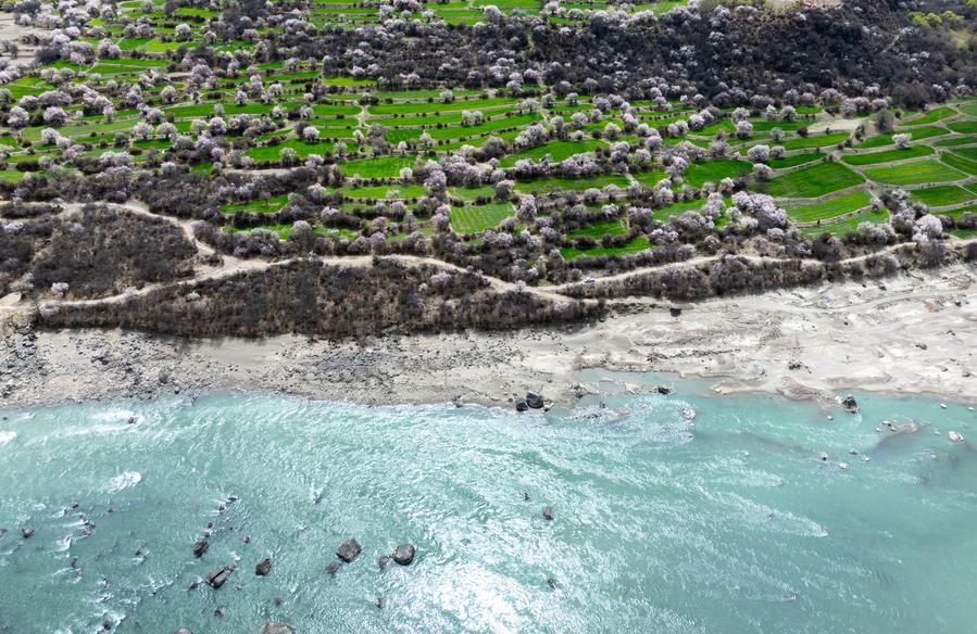 3日、ニンティ市のナムチャバルワ峰の麓に位置するヤルツァンポ大峡谷で咲く桃の花。(ドローンから、ニンティ=新華社記者/丁増尼達)