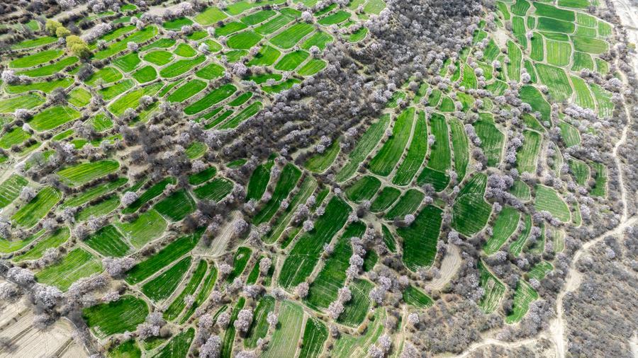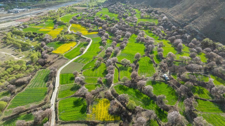 2日、ニンティ市巴宜区朶当村で咲く桃の花。(ドローンから、ニンティ=新華社記者/丁増尼達)