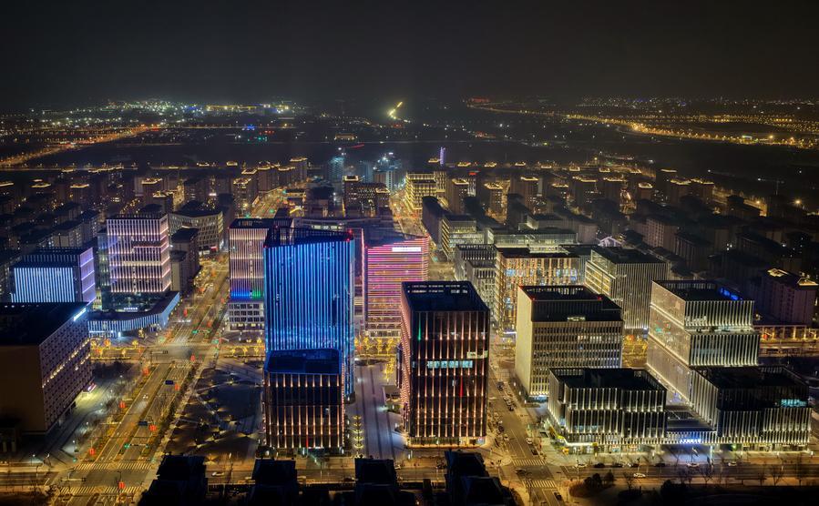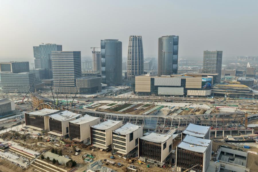 雄安新区のビジネスサービスセンターエリア。(3月16日、ドローンから、雄安=新華社記者/楊世尭)