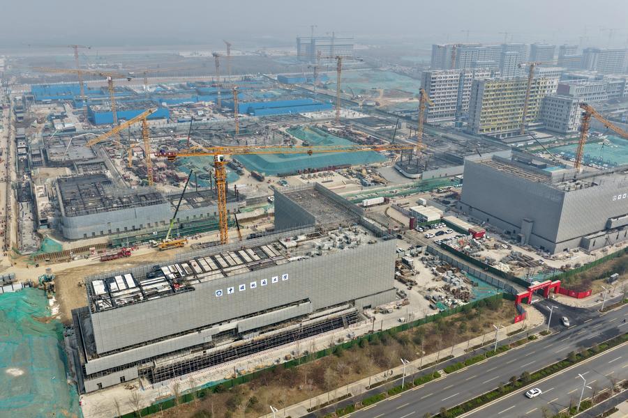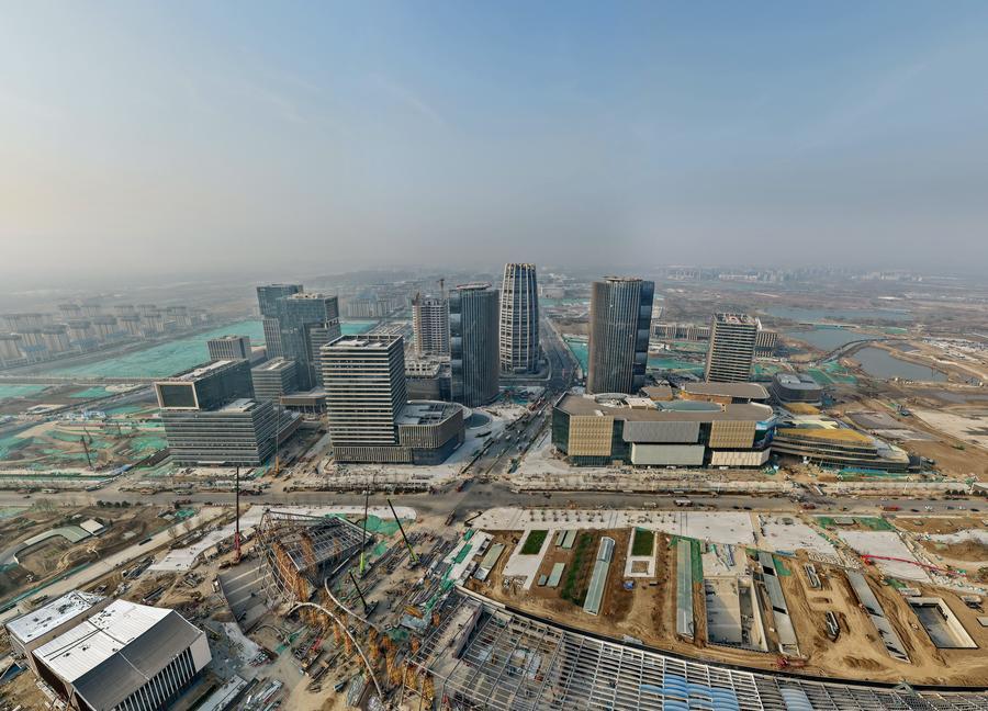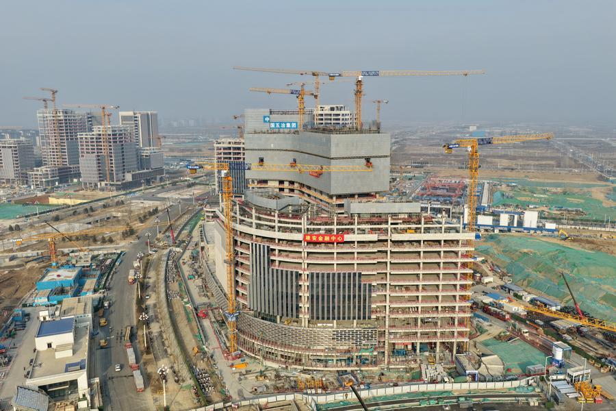 3月25日、雄安新区の先行開発区で建設が進む雄安金融センター。(ドローンから、雄安=新華社記者/牟宇)