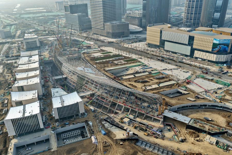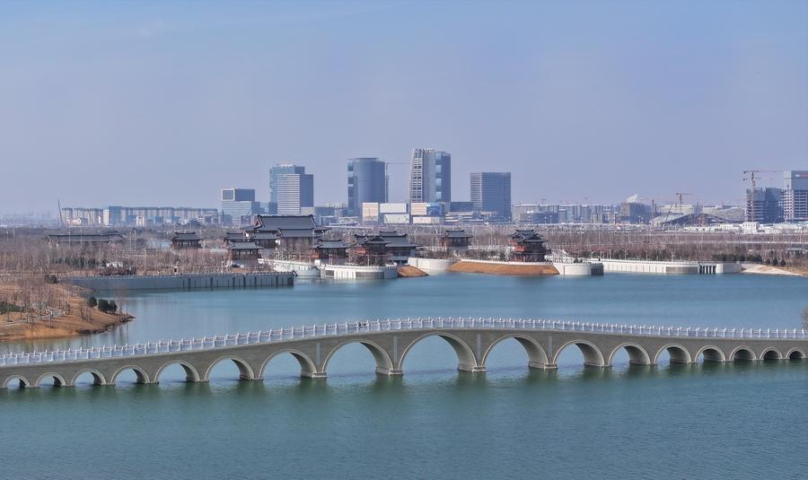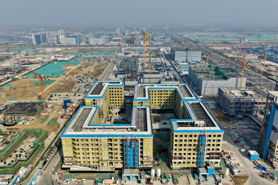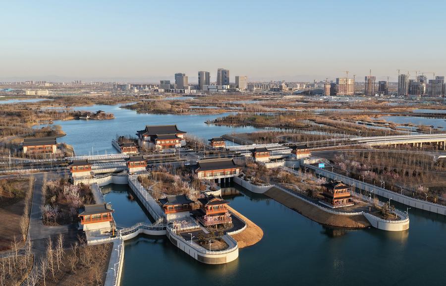 雄安新区南河ハブの風景。(3月18日、ドローンから、雄安=新華社記者/楊世尭)