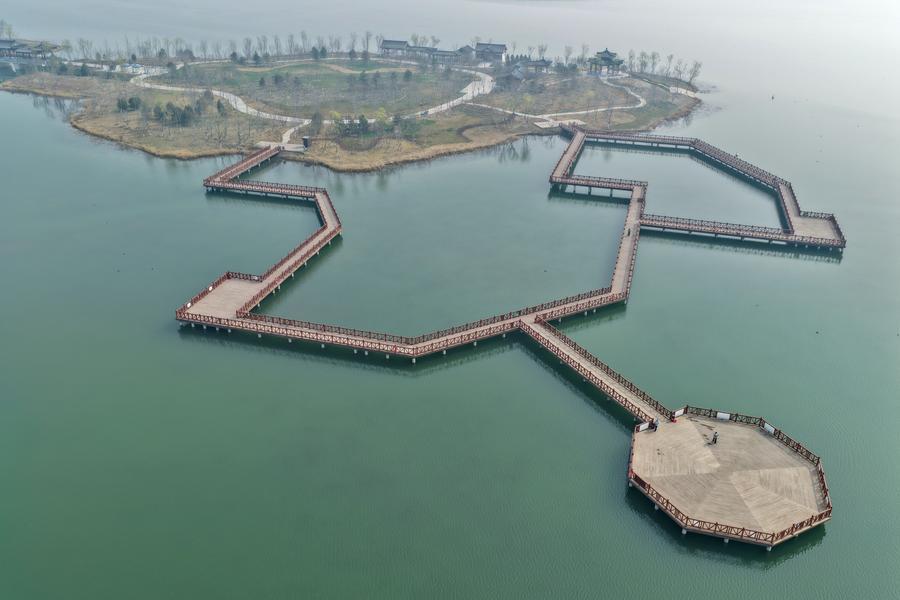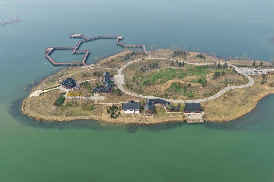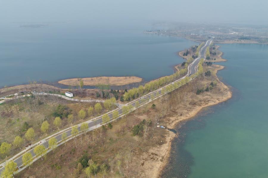 3月26日、雄安新区の白洋淀にある水辺景観エリア「燕南堤」。(ドローンから、雄安=新華社記者/牟宇)
