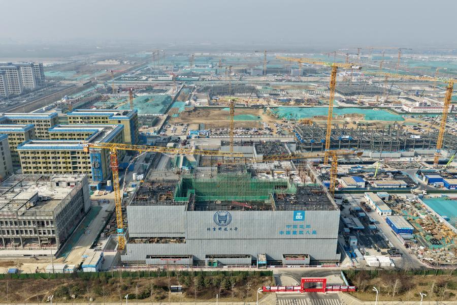 3月25日、北京科技大学雄安キャンパスの建設現場。(ドローンから、雄安=新華社記者/牟宇)