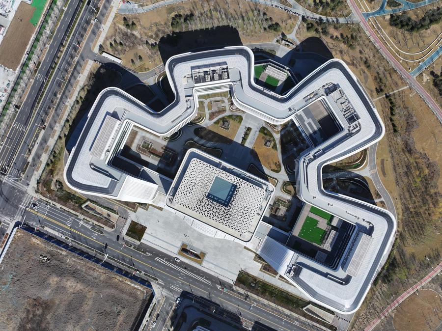 雄安新区の先行開発区にある中国衛星網絡集団の本部ビル。(3月18日、ドローンから、雄安=新華社記者/朱旭東)