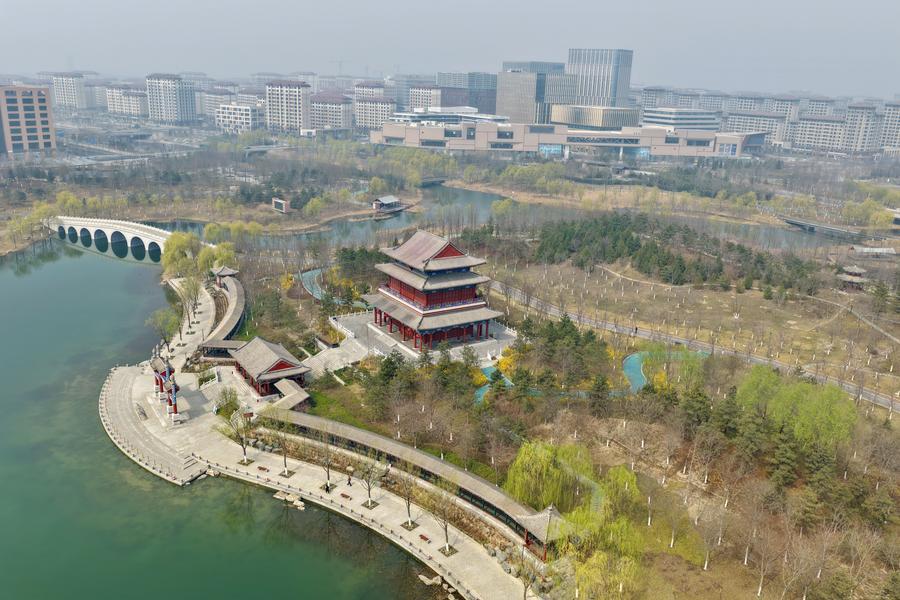 3月26日、雄安新区の容東エリアにある金湖公園。(ドローンから、雄安=新華社記者/牟宇)