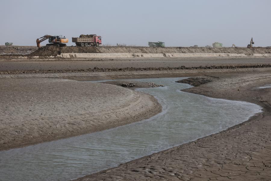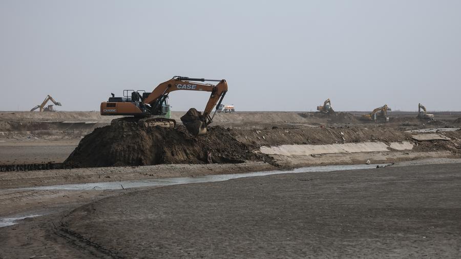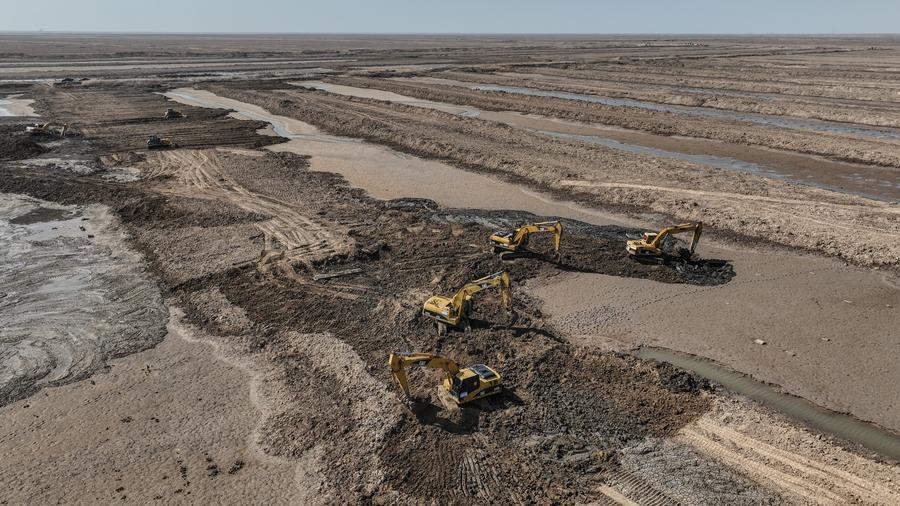 【新華社盤錦4月5日】中国遼寧省盤錦市の遼河口国家級自然保護区では現在、海洋生態保護・修復プロジェクトが実施されており、重機を使った地形修復が進んでいる。