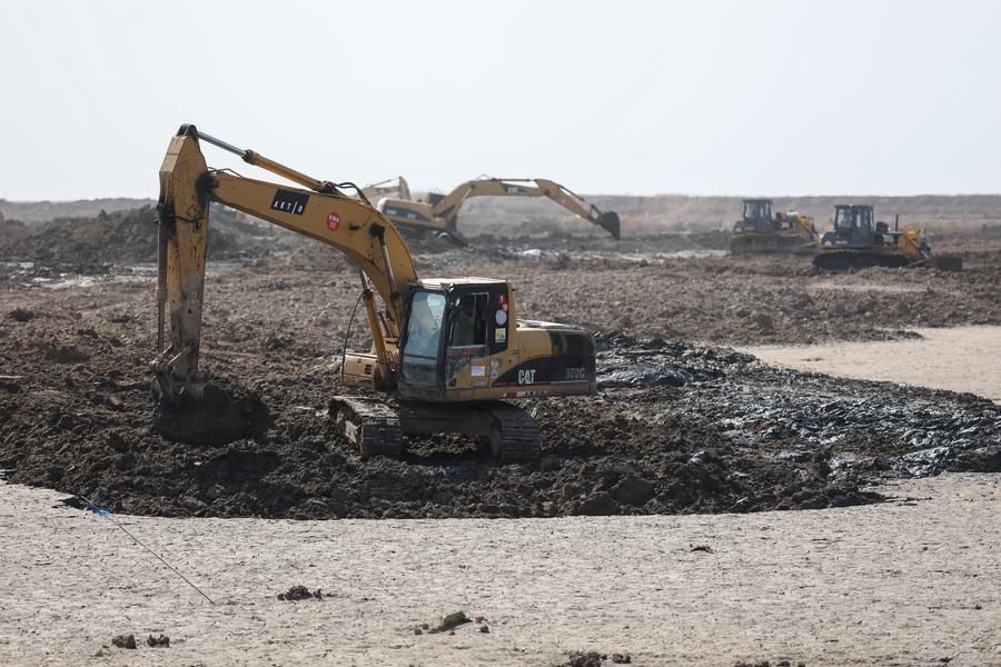 1日、湿地修復の現場で作業する重機。(ドローンから、盤錦=新華社記者/潘昱竜)