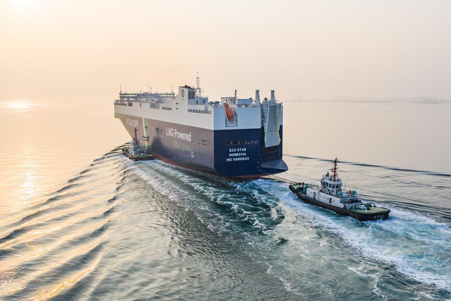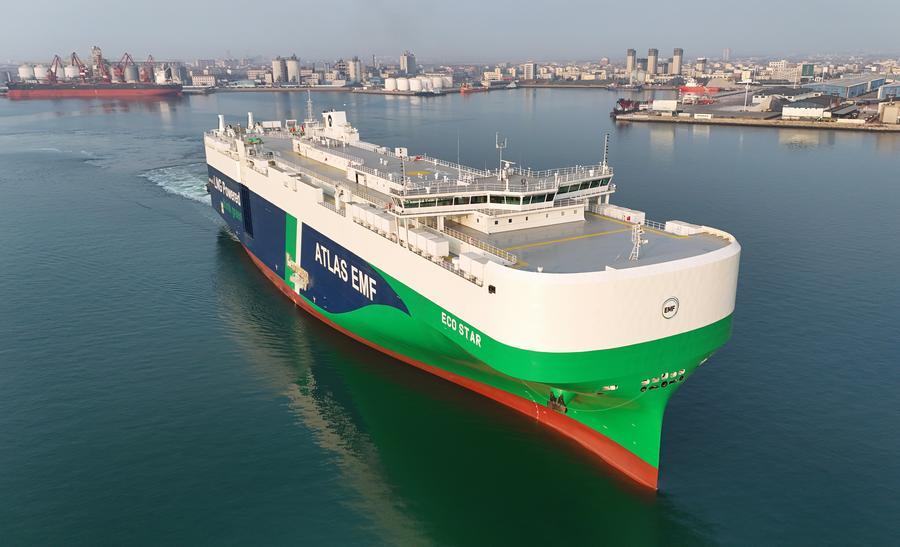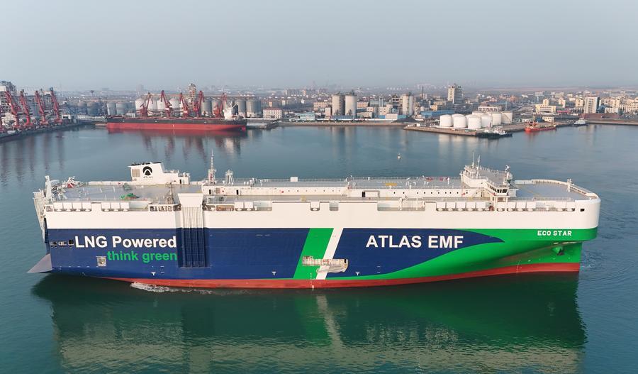 【新華社済南4月6日】中国山東省の煙台港竜口港区で2日、7千台の積載能力を備えた二元燃料(デュアルフューエル)自動車運搬船「潔能之星」が就航した。同船は液化天然ガス(LNG)を燃料とする動力システムを搭載するほか、アンモニア燃料にも対応できる設計で、クリーンなアンモニア燃料へのアップグレード改修が可能となる。中国造船大手の煙台中集来福士海洋工程(CIMCラッフルズ)がギリシャの海運会社向けに建造し、3月30日の引き渡し後、竜口港区に到着した。