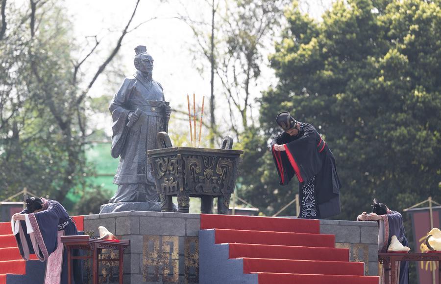 3日、都江堰風景区で開催された2026年都江堰放水大典で、古礼に則り祭祀(さいし)を執り行う祭主。(都江堰=新華社記者/江宏景)
