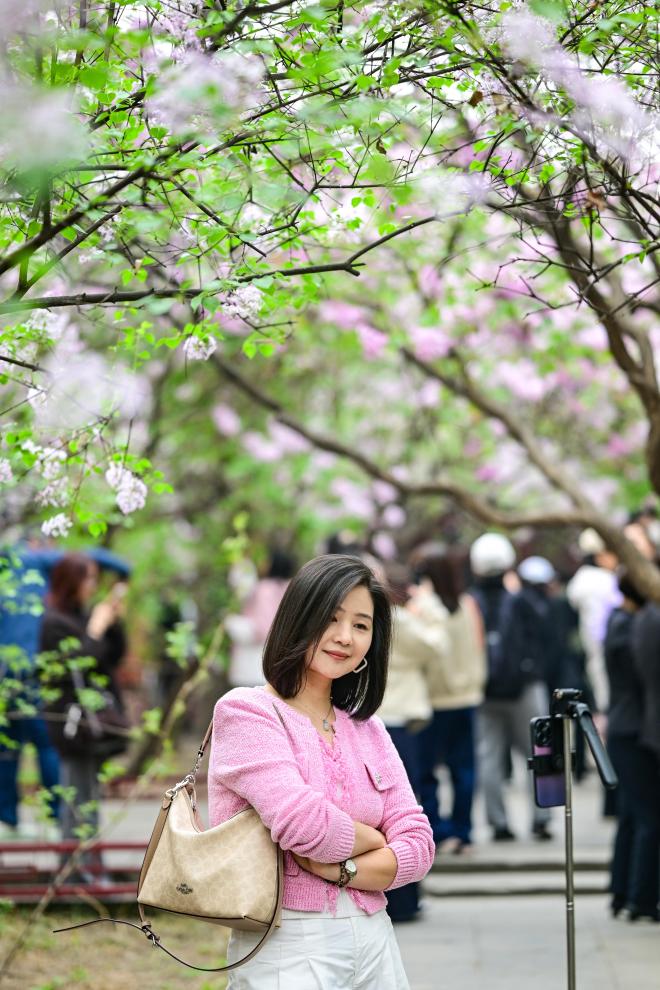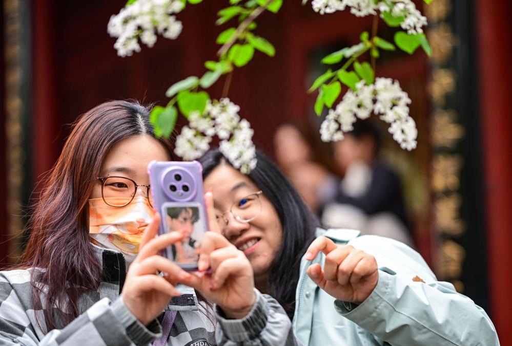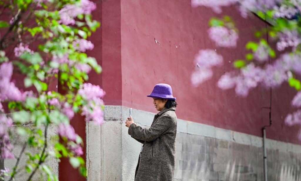 3日、法源寺でライラックを背景に自撮りを楽しむ観光客。(北京=新華社記者/陳曄華)