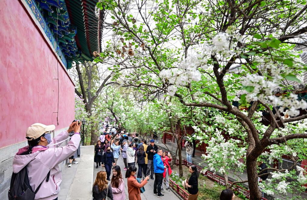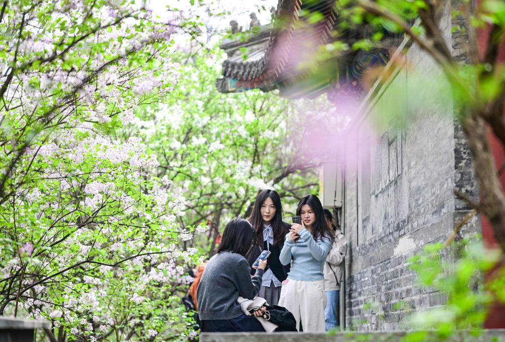 3日、法源寺でライラックの花見を楽しむ観光客。(北京=新華社記者/陳曄華)