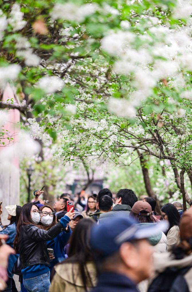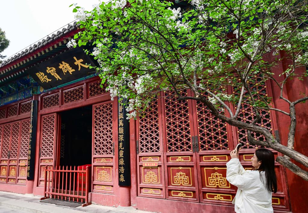3日、法源寺でライラックを撮影する観光客。(北京=新華社記者/陳曄華)