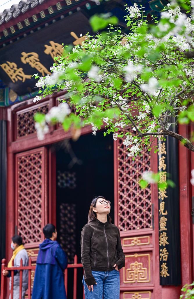 3日、法源寺でライラックを観賞する観光客。(北京=新華社記者/陳曄華)