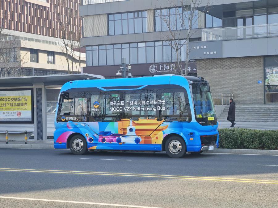 雄安新区容東エリアを走る「路車協調」型自動運転バス。(3月20日撮影、雄安=新華社記者/朱旭東)