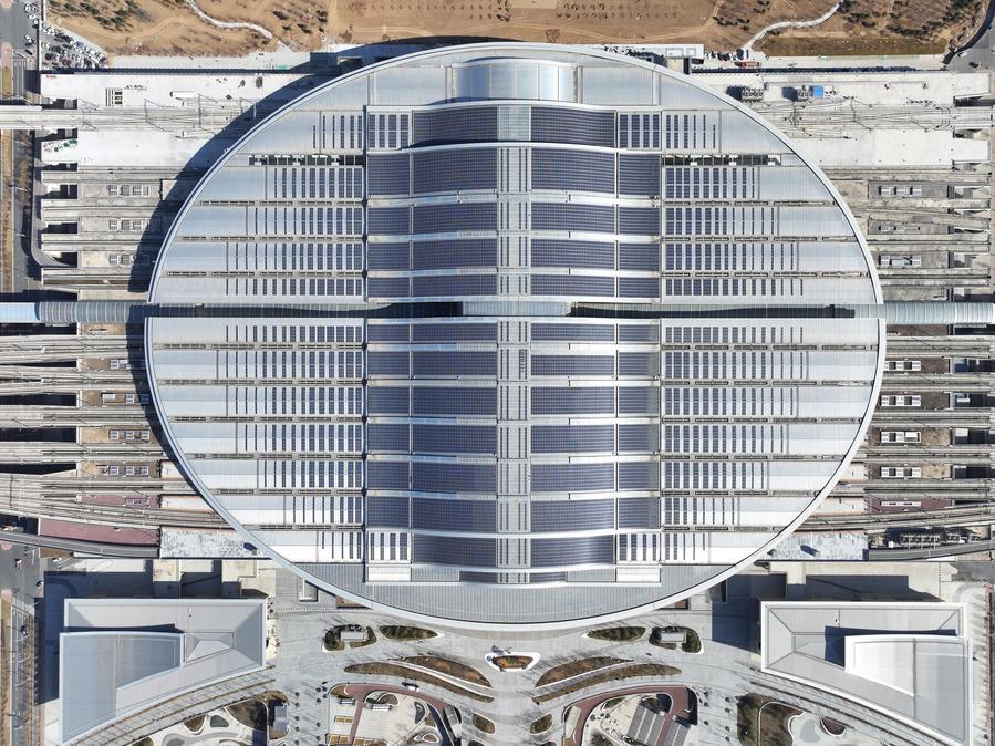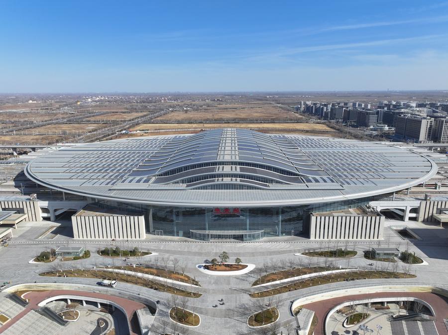 北京市と雄安新区を結ぶ京雄都市間鉄道の雄安駅。(3月18日、ドローンから、雄安=新華社記者/朱旭東)