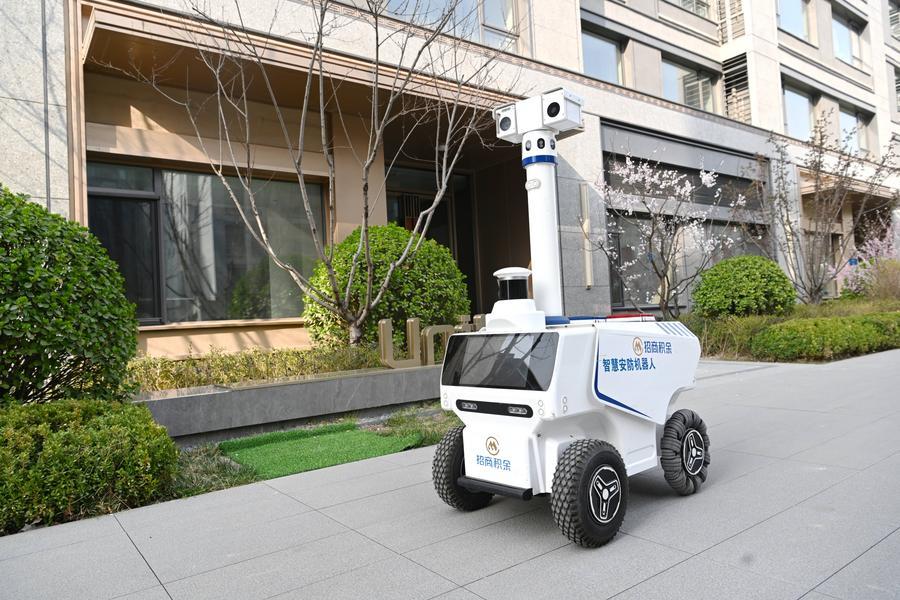 3月25日、雄安新区の華清園小区(居住区)を巡回するスマートセキュリティーロボット。(雄安=新華社記者/朱旭東)