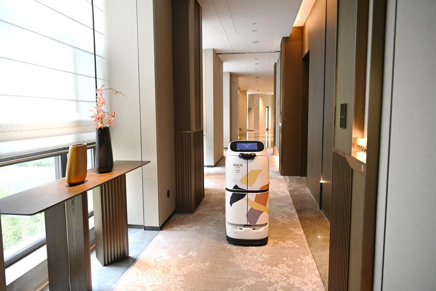 3月26日、雄安新区容東エリアのホテルで宿泊客に食事を届けるデリバリーロボット。(雄安=新華社記者/朱旭東)