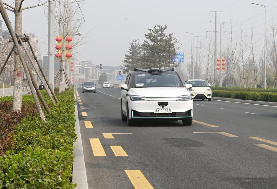 3月26日、雄安新区容東エリアを走る自動運転配車サービスの車。(雄安=新華社記者/朱旭東)