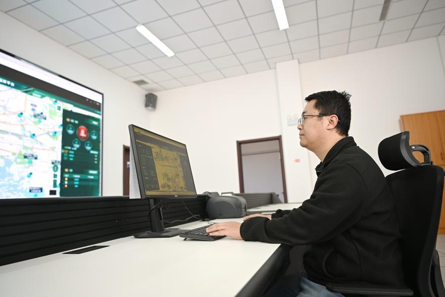 雄安新区の管理・調整室で、林業・草原総合管理保護プラットフォームを通じて業務の調整を行う職員。(雄安=新華社記者/朱旭東)