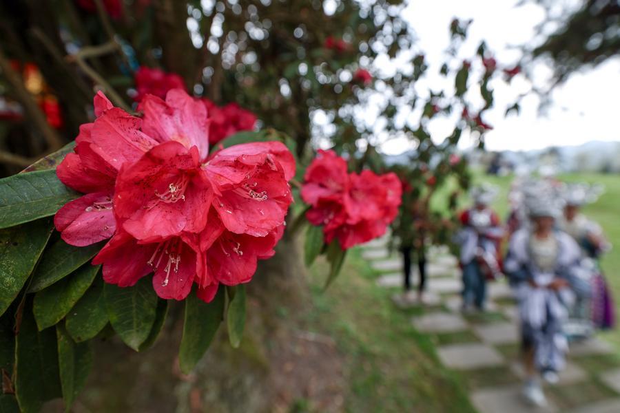 3月29日、百里杜鵑管理区の普底風景区でパフォーマンスを楽しむ観光客。(畢節=新華社配信/李華)