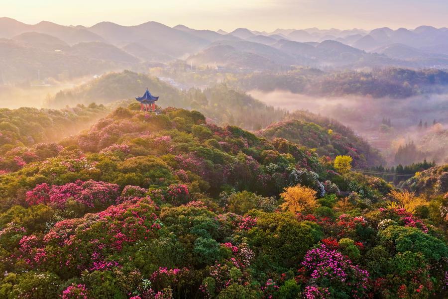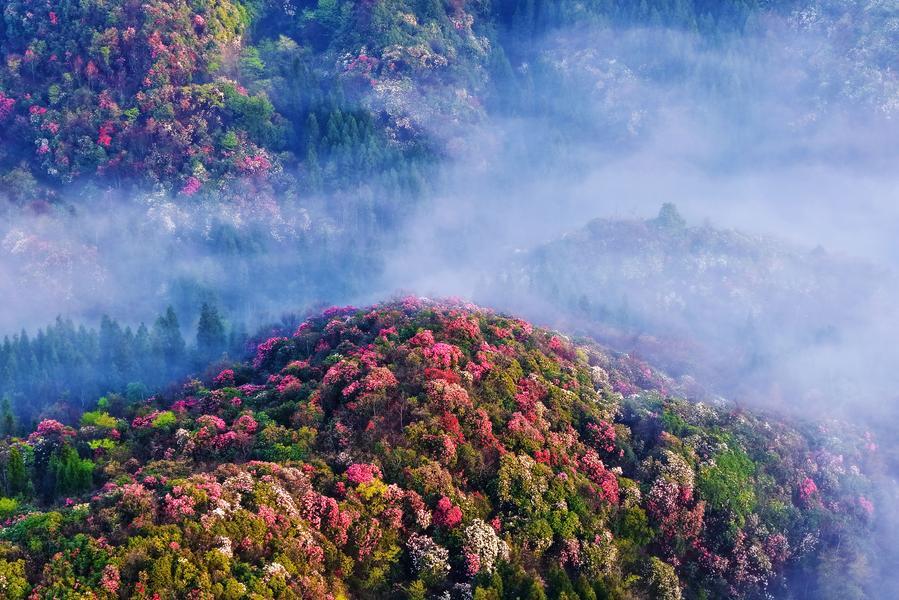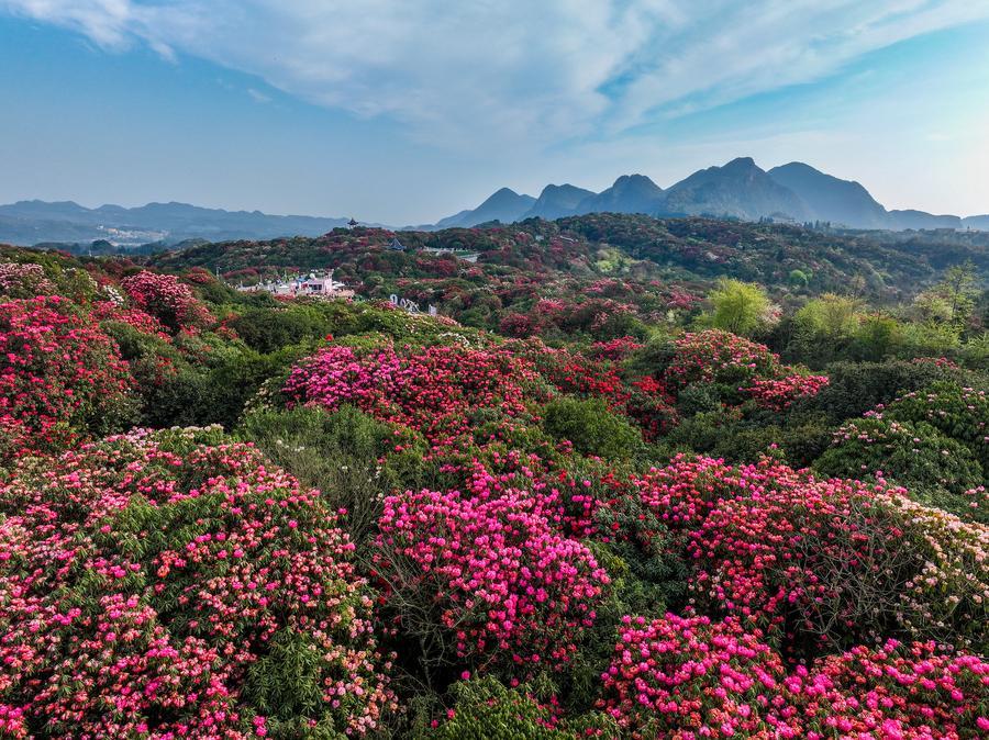 1日、百里杜鵑管理区の普底風景区を彩る満開のツツジの花。(ドローンから、畢節=新華社配信/陳鶴)