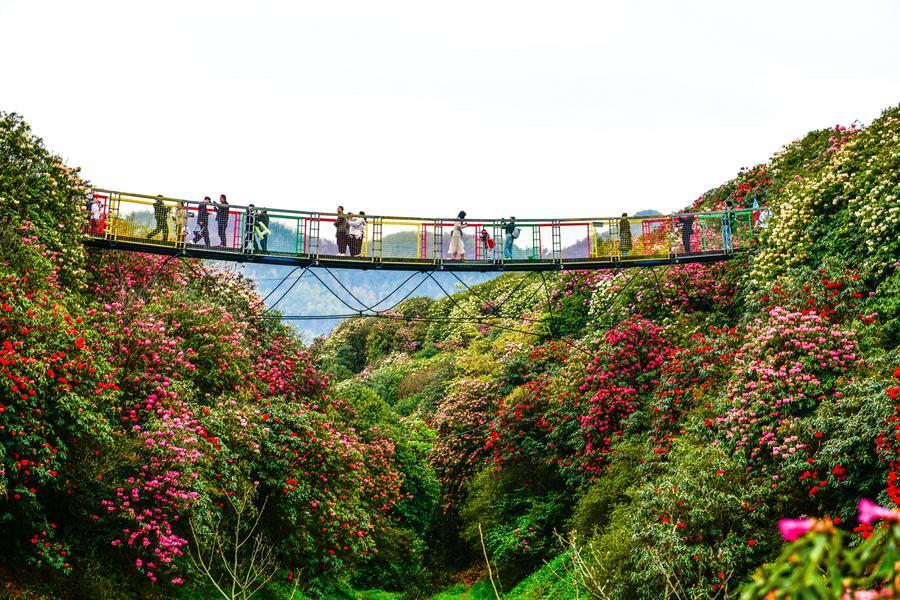 1日、百里杜鵑管理区の金坡風景区にあるつり橋を渡る観光客。(畢節=新華社記者/楊文斌)