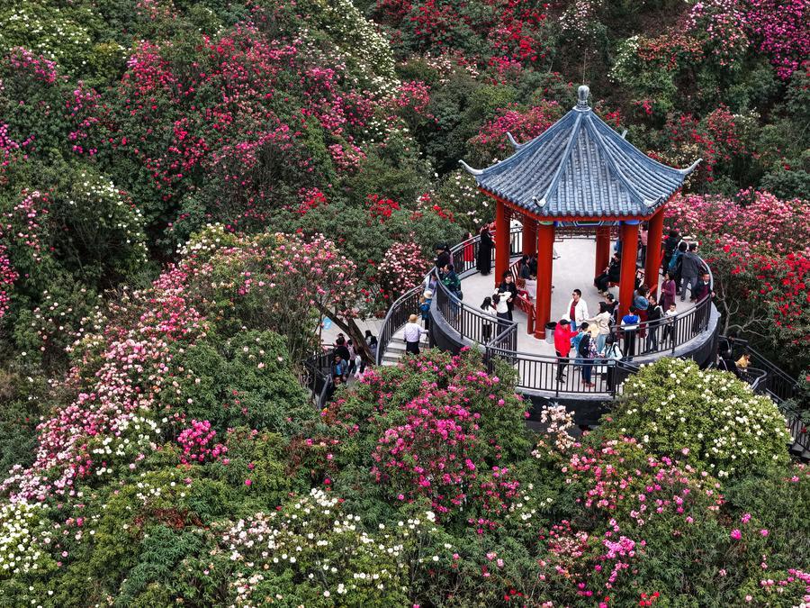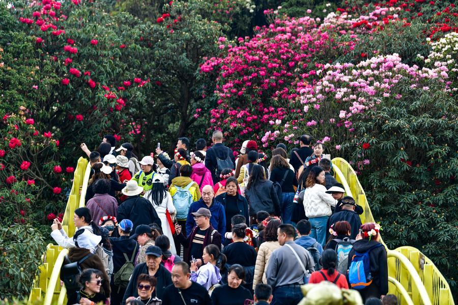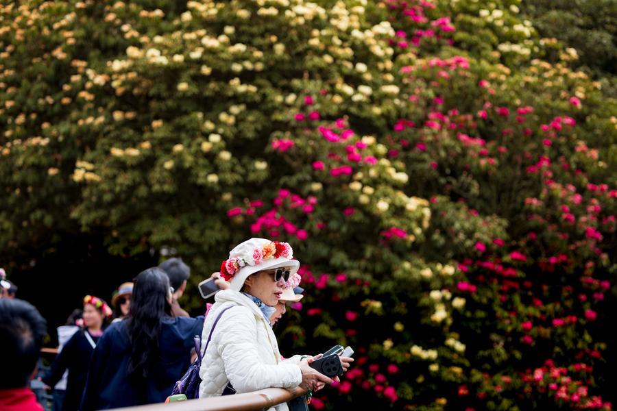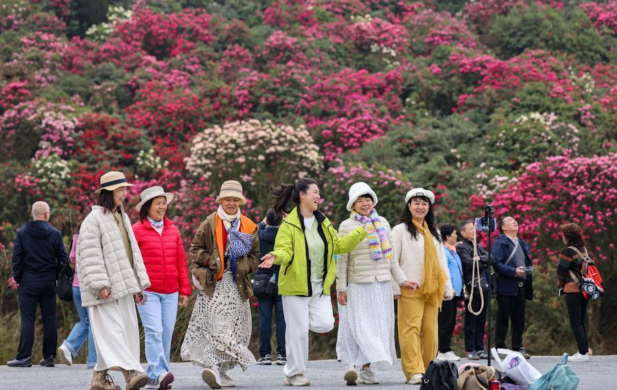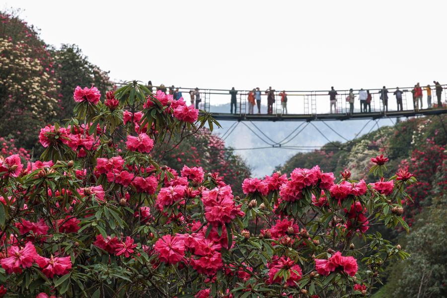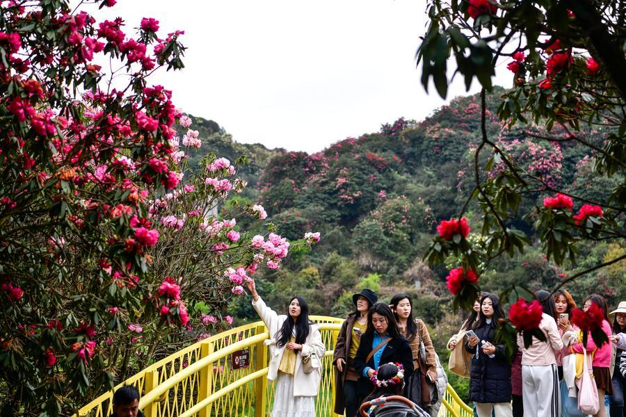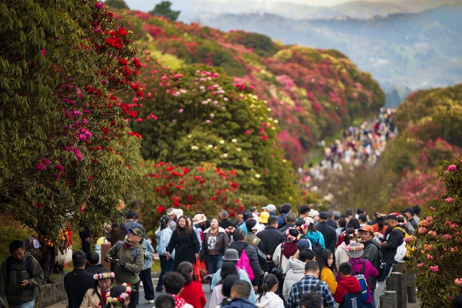 1日、百里杜鵑管理区の金坡風景区で花見を楽しむ観光客。(畢節=新華社記者/楊文斌)
