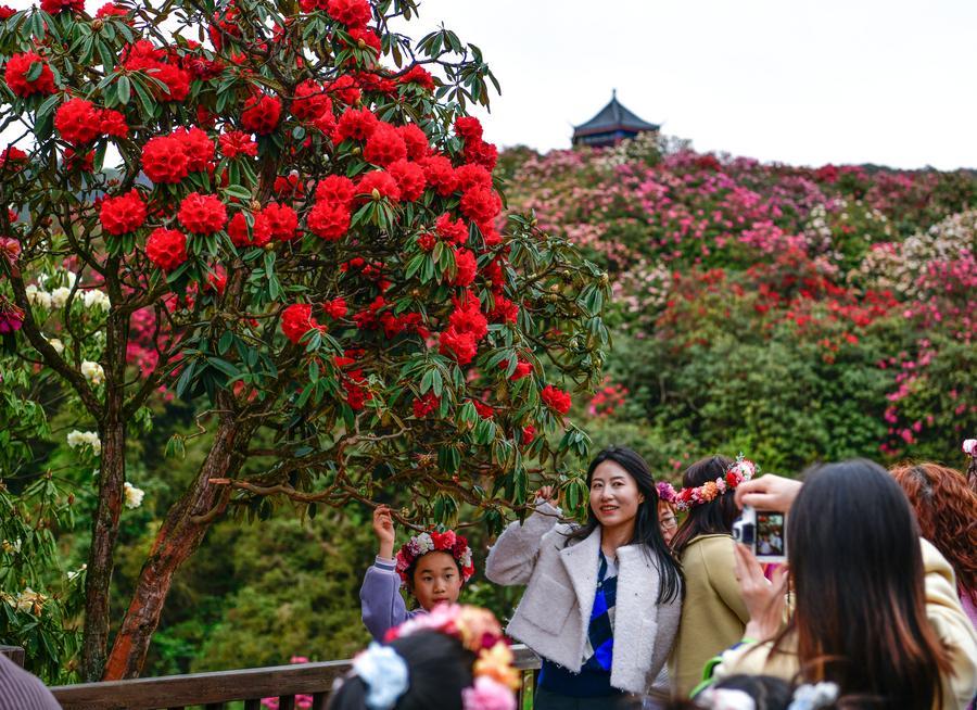 3月26日、百里杜鵑管理区の普底風景区で記念撮影をする観光客。(畢節=新華社配信/胡攀学)