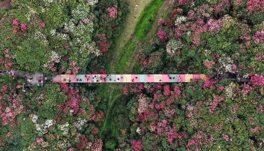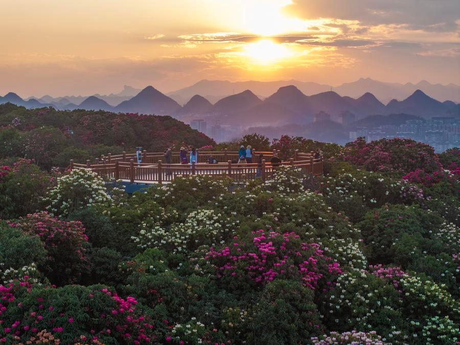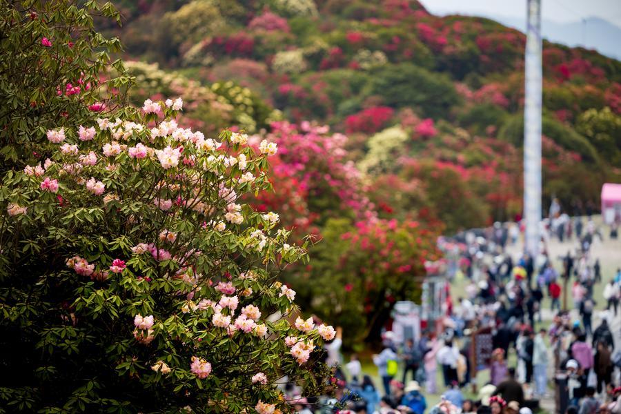山を覆う満開のツツジの花は観光市場に活力を注ぎ込むだけでなく、ツツジモチーフのオリジナルグッズ製作や花卉(かき)栽培、特色ある民宿など、産業の発展を促進している。管理区では昨年、観光客800万人余りが訪れ、花卉栽培産業の生産高は1千万元(1元=約23円)を超えた。