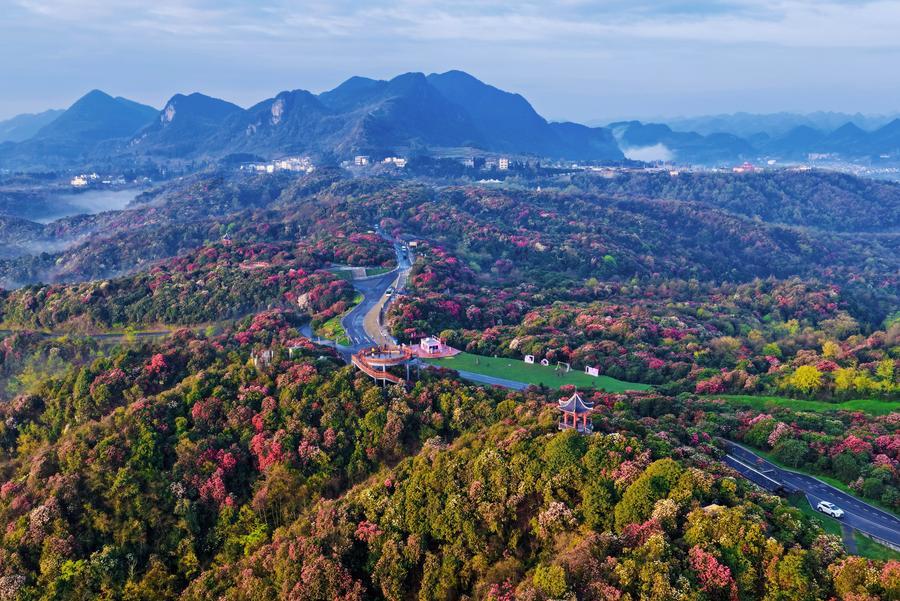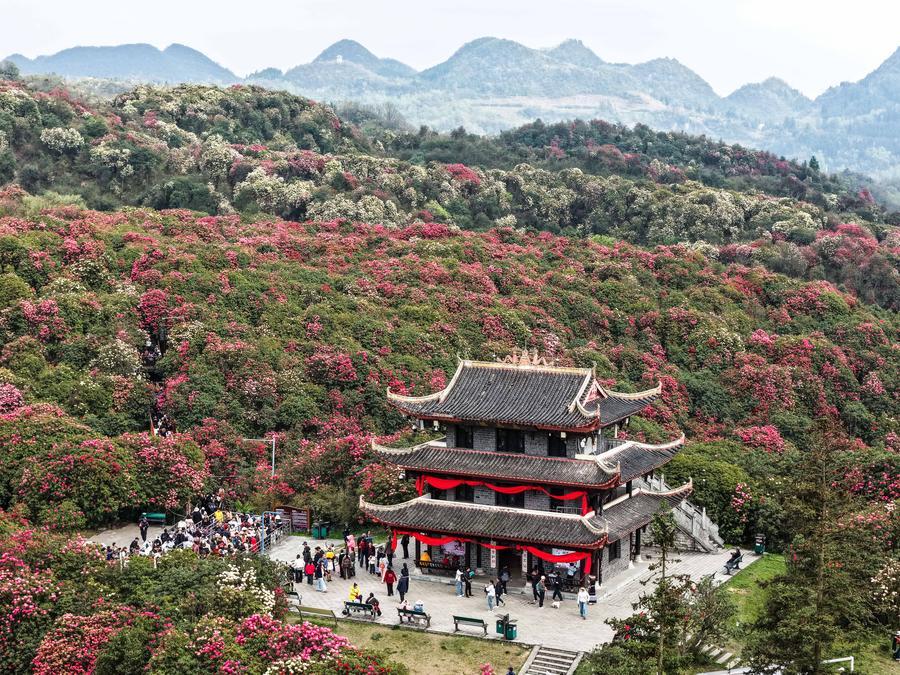 3月25日、百里杜鵑管理区の普底風景区を彩る満開のツツジの花。(ドローンから、畢節=新華社配信/胡攀学)