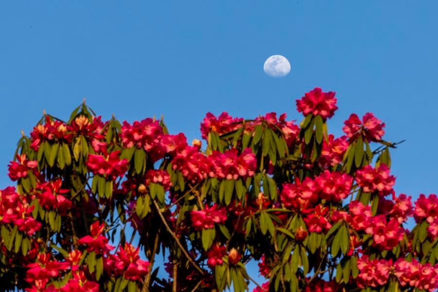 3月29日、百里杜鵑管理区の普底風景区で満開となったツツジの花と空に浮かんだ月。(畢節=新華社配信/李華)
