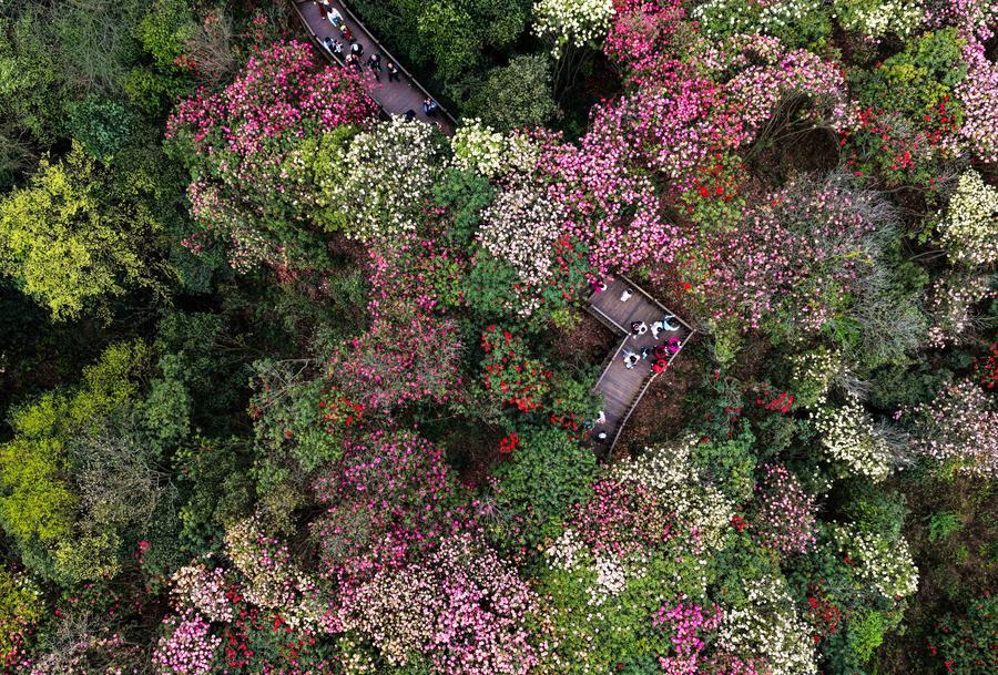 【新華社畢節4月8日】中国貴州省畢節(ひっせつ)市の百里杜鵑管理区でこのほど、ツツジの花が見頃を迎えた。管理区には野生のツツジが125・8平方キロにわたって自生し、毎年3~4月には40種以上が咲き誇り、各地からの観光客を引きつけている。