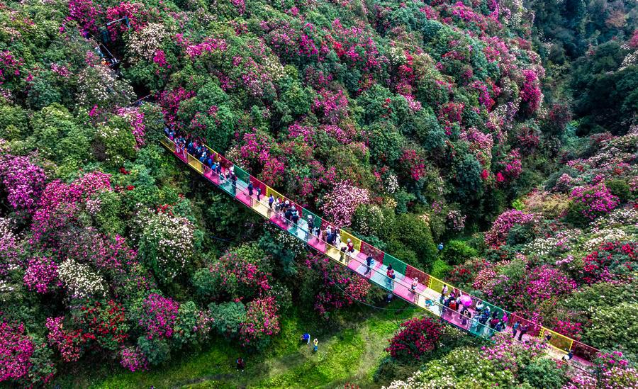 1日、百里杜鵑管理区の普底風景区で花見を楽しむ観光客。(畢節=新華社記者/劉続)