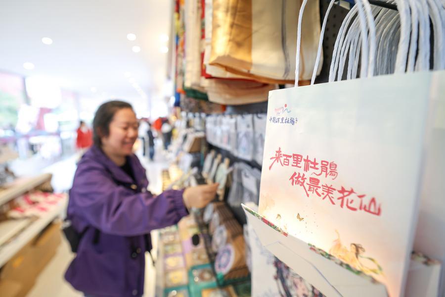 3月28日、百里杜鵑管理区の金坡風景区で文化クリエーティブ製品を選ぶ観光客。(畢節=新華社配信/韓賢普)