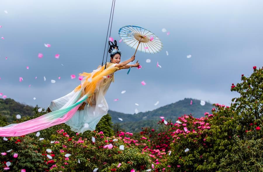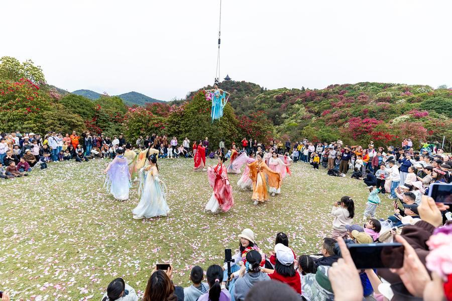 3月26日、百里杜鵑管理区の普底風景区でパフォーマンスを披露する出演者。(畢節=新華社配信/范暉)