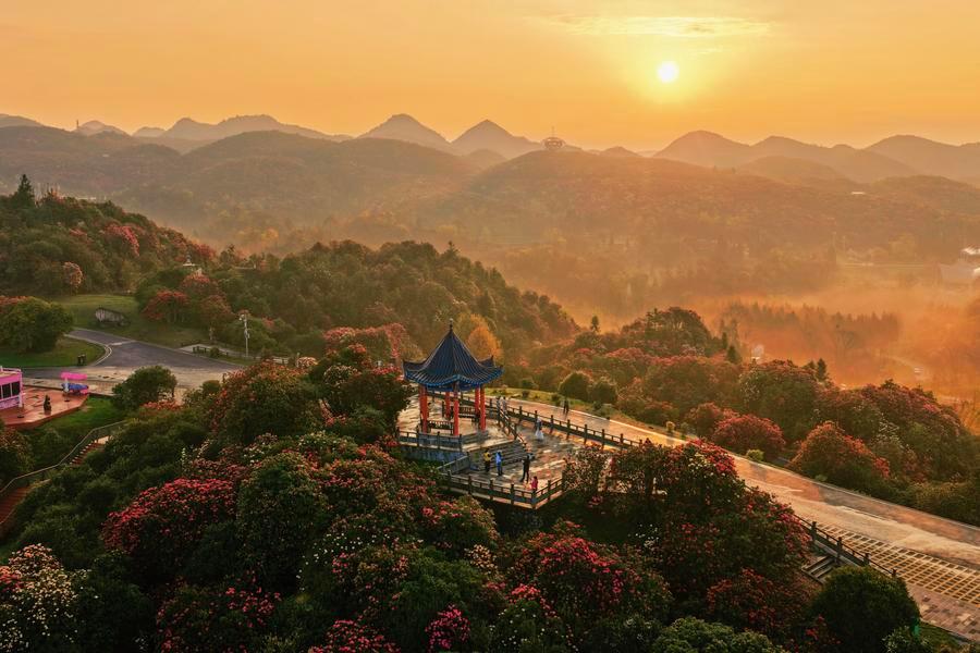 1日、朝日に染まった百里杜鵑管理区の普底風景区。(ドローンから、畢節=新華社配信/陳鶴)