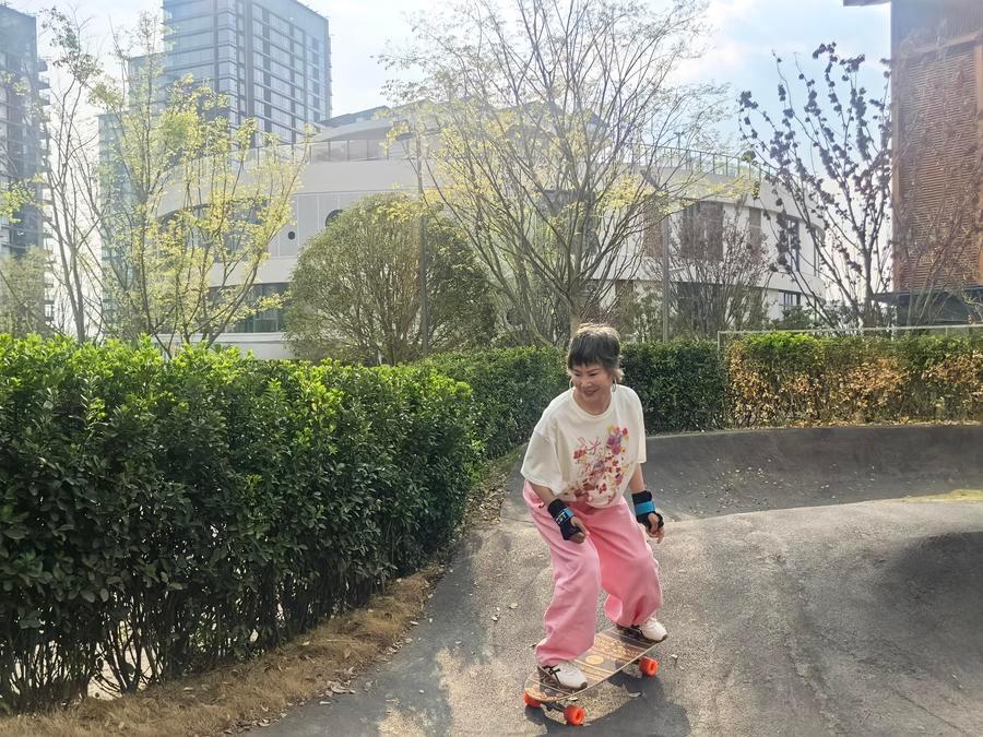 王さんは「半年前に偶然、自分と同じくらいの年齢の人がスケートボードをしている動画を見て、触発された。数カ月学んでみて、少しずつでも進歩を実感するたびに、体中が生命力に満たされるのを感じる」と語る。