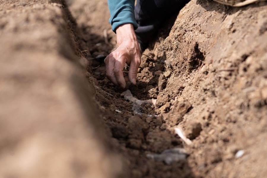 5日、安徽省銅陵市の大通鎮大院村で、白ショウガを植え付ける農家の人。(銅陵=新華社記者/張端)