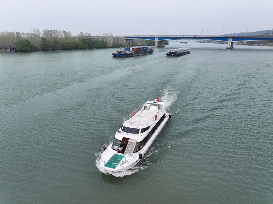 3日、淮安市盱眙県で遊覧船に乗り淮河の風景を楽しむ観光客。(ドローンから、淮安=新華社記者/季春鵬)