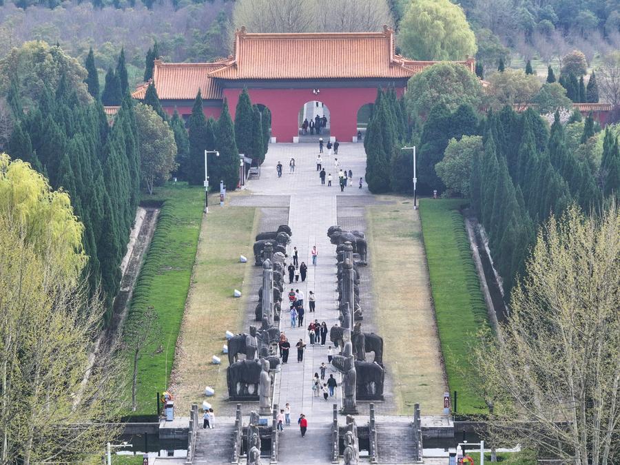 3日、淮安市盱眙県にある国家4A級(5段階の上から2番目)風景区、明祖陵を見学する観光客。(ドローンから、淮安=新華社記者/季春鵬)