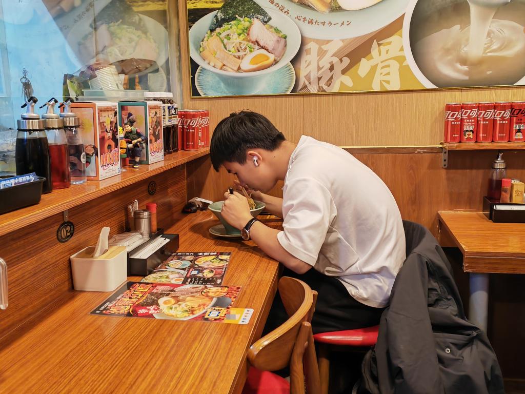 大連市の小野家拉麺でラーメンを味わう客。(2025年11月8日撮影、大連=新華社記者/張博群)