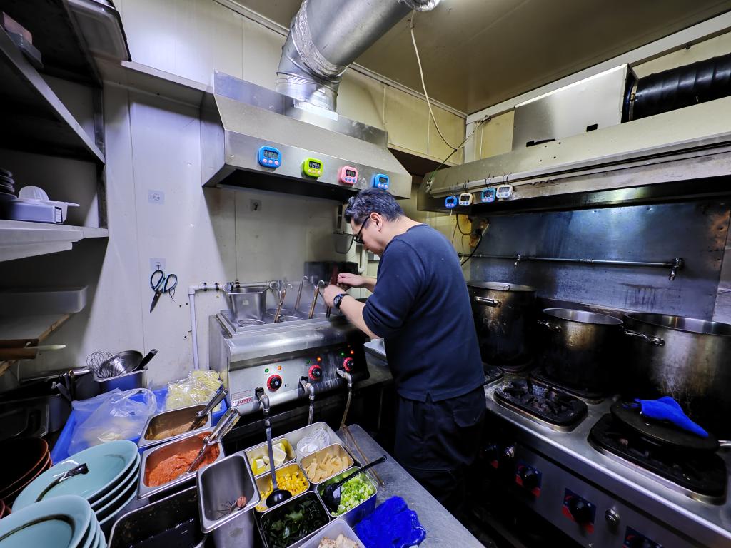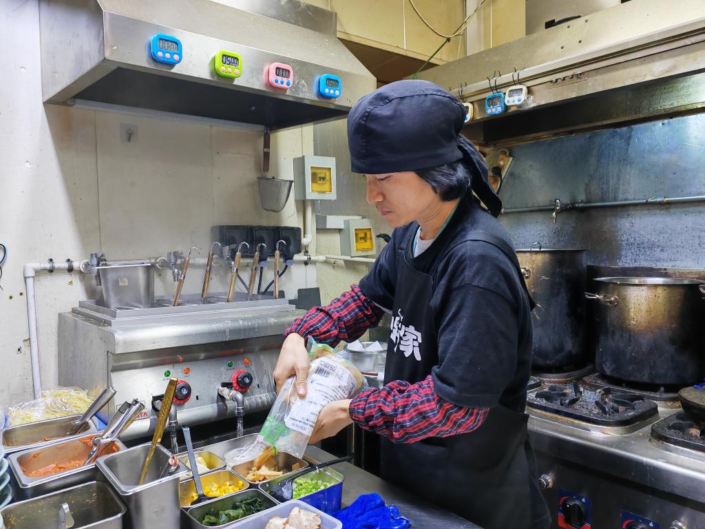 大連市の小野家拉麺の厨房で食材を準備する従業員。(2025年11月8日撮影、大連=新華社記者/張博群)