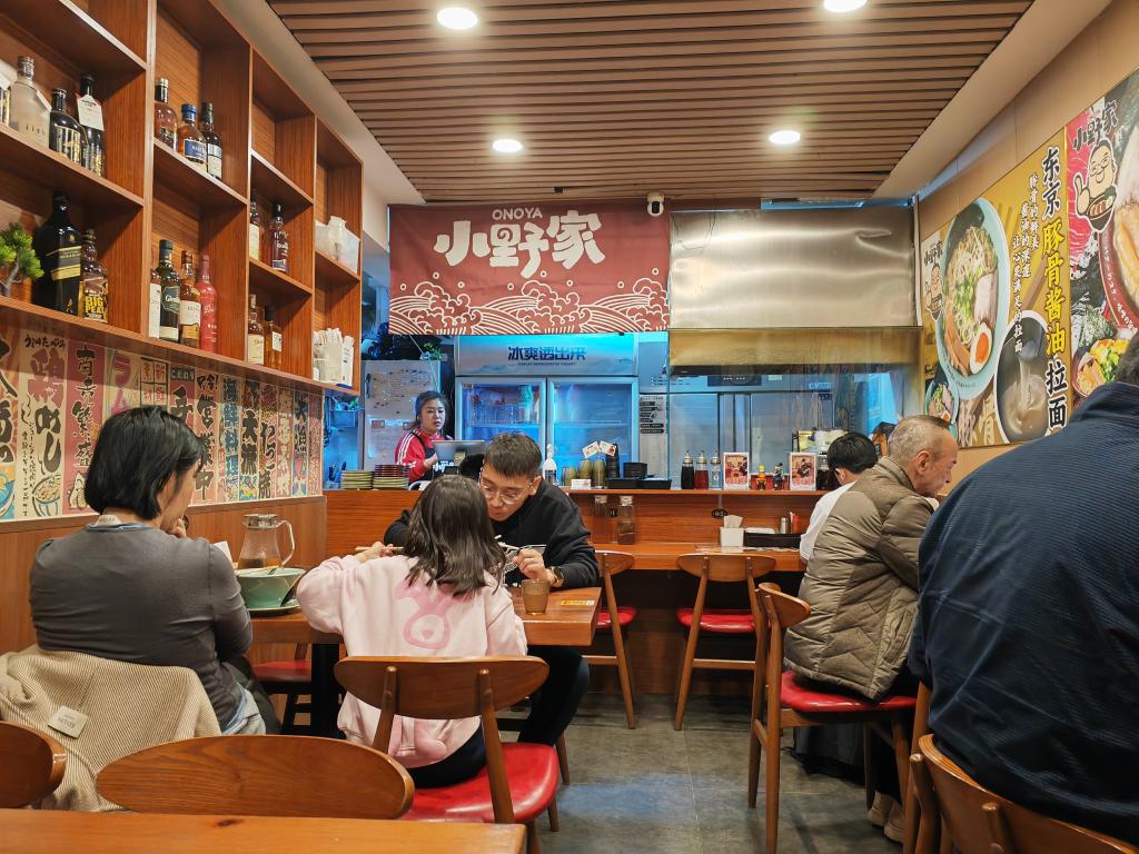 大連市の小野家拉麺でラーメンを味わう来店客ら。(2025年11月8日撮影、大連=新華社記者/張博群)
