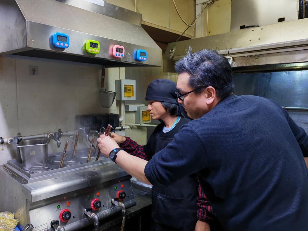 大連市の小野家拉麺の厨房で、従業員に麺のゆで方を教える小野光規さん(手前)。(2025年11月8日撮影、大連=新華社記者/張博群)