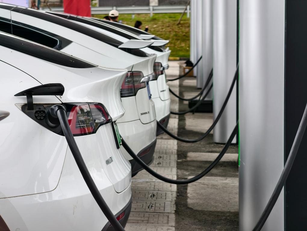 重慶市の高速道路の大足石刻SAにあるテスラ急速充電ステーションで充電中のEV。(3月28日撮影、重慶=新華社配信)