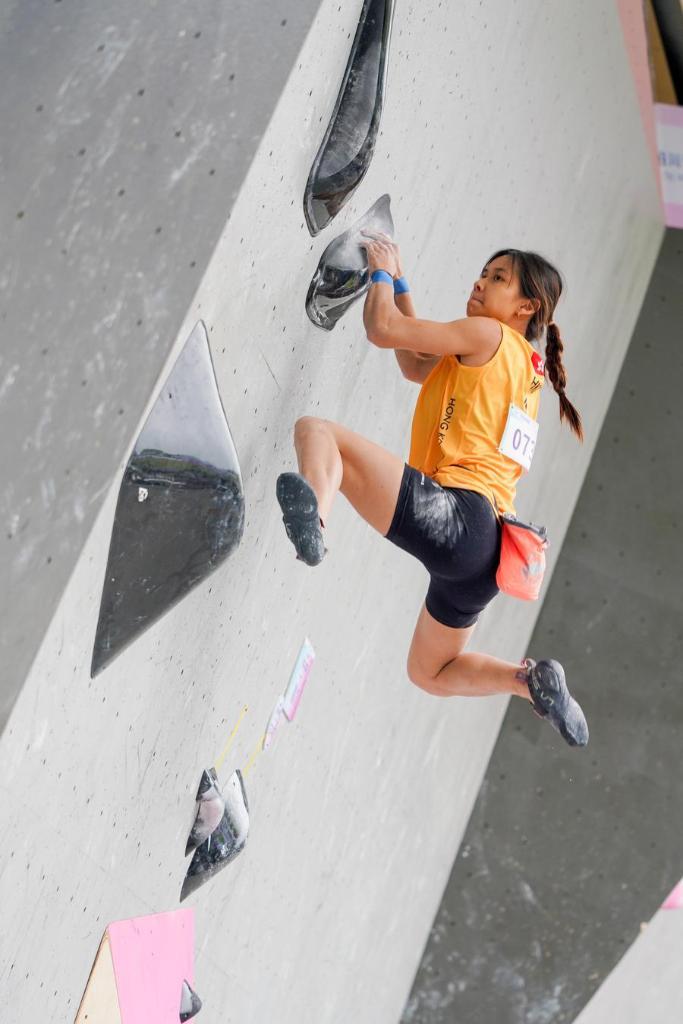 8日、女子ボルダー予選に臨む中国香港の黄浄淳(こう・じょうじゅん)。(眉山=新華社配信/翁光建)