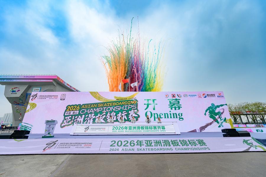 8日、2026年スケートボードアジア選手権大会の開会式。(眉山=新華社配信)