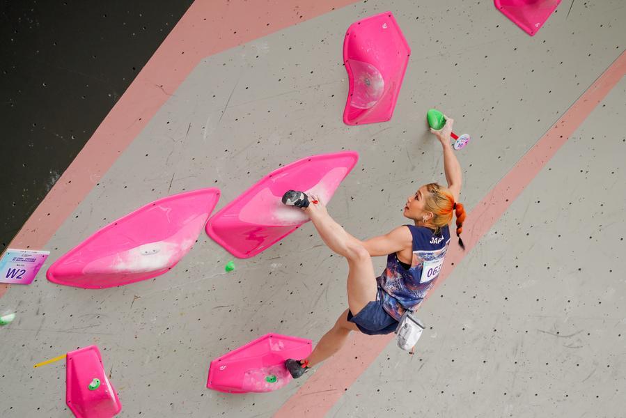 8日、女子ボルダー予選に臨む日本の野中生萌。(眉山=新華社配信/翁光建)