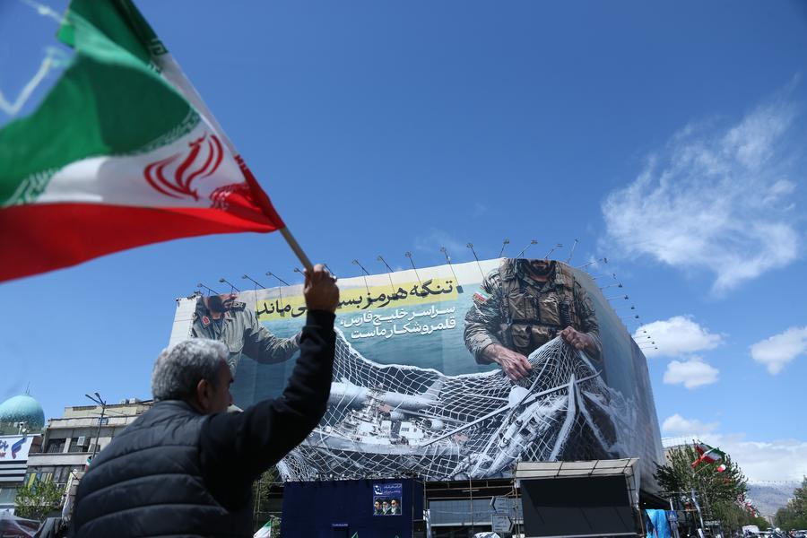 8日、イランの首都テヘランのエンゲラブ広場で集会に参加する男性。(テヘラン=新華社記者/沙达提)